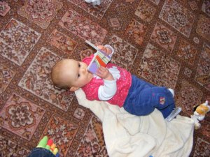 As for being too young for books, my 11 month old daughter already loves her books, granted she usually has them upside down or in her mouth but she still loves them. I often go into her bedroom on a morning to discover her sitting up pointing at one of her tiny board books, grinning broadly and turning the pages three at a time.
