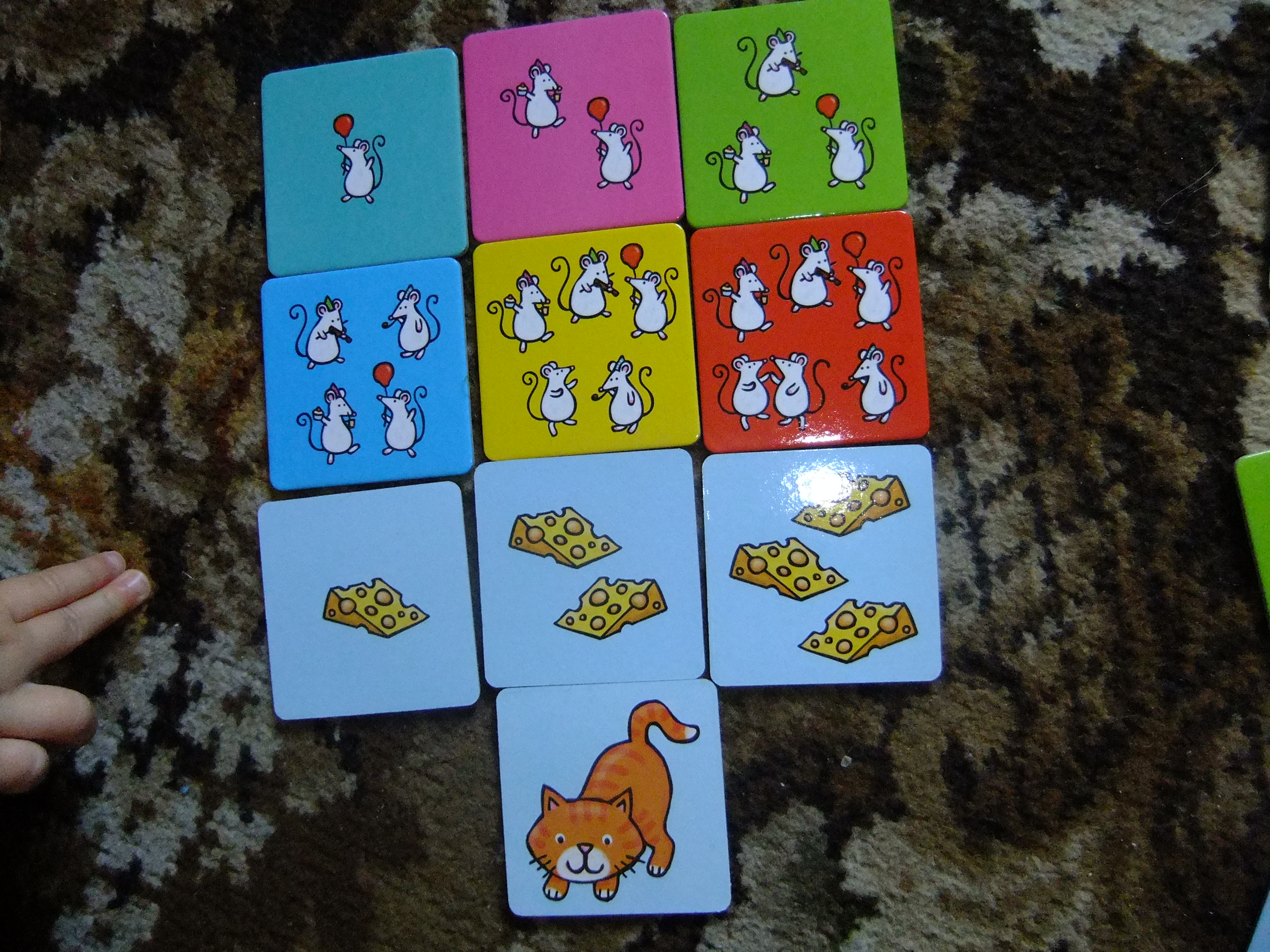 On your turn you spin the spinner and see what number you get. Then you have to find a card with a corresponding number of mice on it and turn it over.
