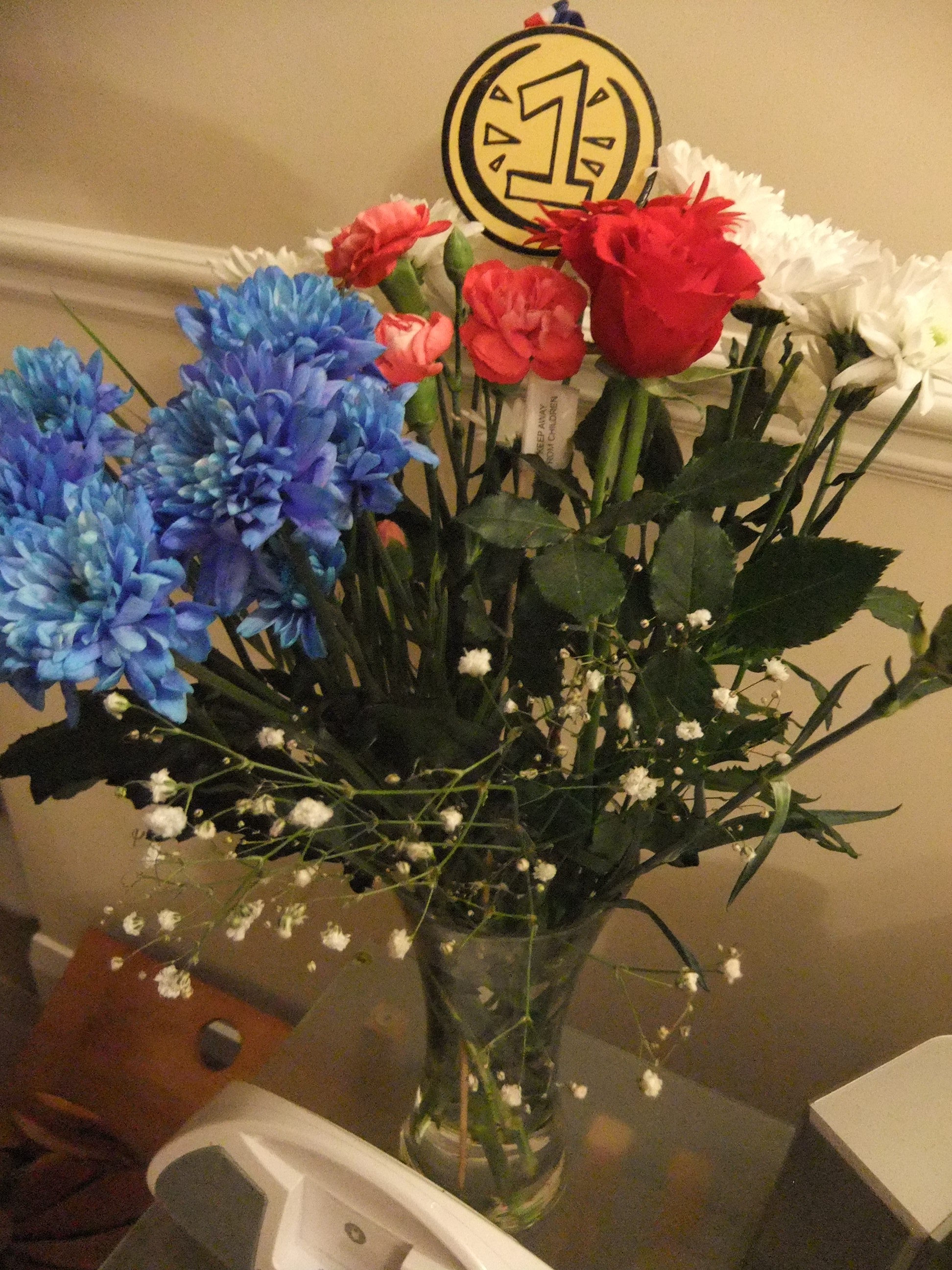 Another busy day which started out with breakfast in Spoons with Caius, Liberty, The Boyfriend, the Smalls and Meggy. Then Meggy, the Smalls and I headed off to her house. After a bit of time chatting with her and Scott, I vanished off to catch a train to London ready for my next Games maker shift tomorrow, leaving them to babysit. Three hours on the train later got me to Stevenage then it was straight in the car with Chrystal and Nad to head to our friends’ house where we are staying the night. After getting ourselves all packed and ready for our early start we settled down to watch the FANTASTIC evening of Olympics Athletics – the flowers Chrystal bought as a ‘thank you for having us’ present turned out to be extra appropriate!