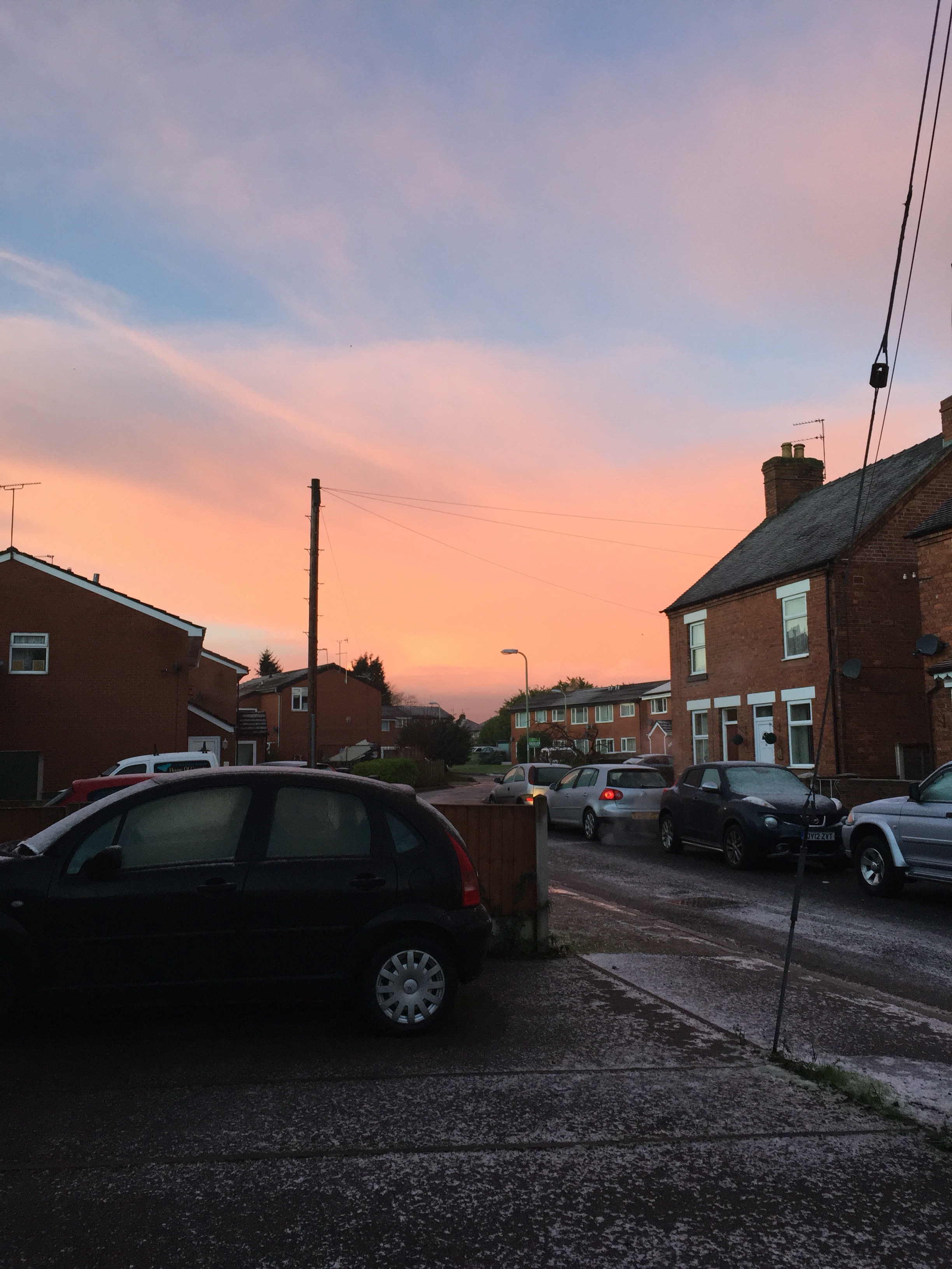 I got all adventurous (for a person who only started knitting in September) in Week 3 (15th-21st) and picked a pattern that knitted on the diagonal instead of in rows. This involved learning how to increase and decrease properly and neatly. I quite enjoyed this square – I like knitting on the diagonal and how the square seems to grow much quicker than doing rows which somehow feels shapeless as you go along. I got to start with my favourite sunrise yarn this week after a spectacular display from the sky on the Friday morning, which was good as the next few days were…wet and grey. Except for Wednesday which was a beautiful cloudless winter blue all day.