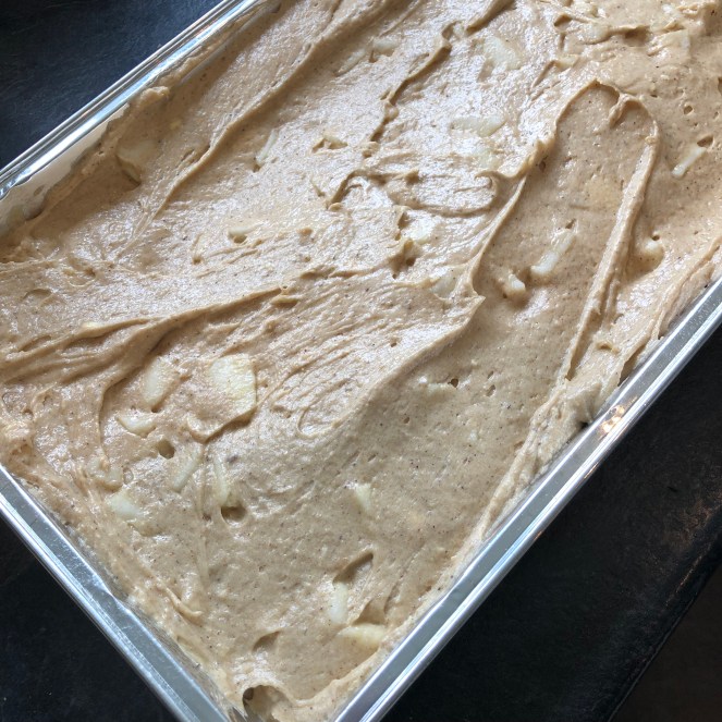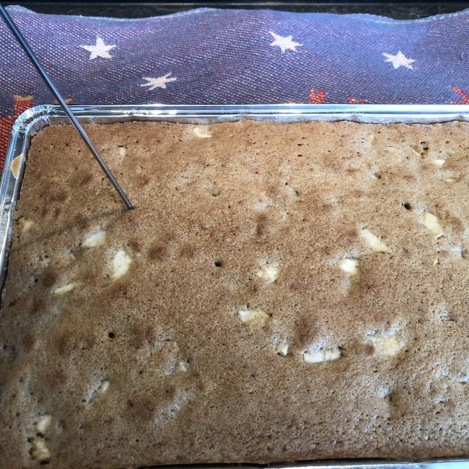 Decant the cake mixture into a greased traybake tin (I’m using a disposable one here because the cake was destined for a bake sale I wasn’t attending!) and put into the oven for 22-25 minutes.