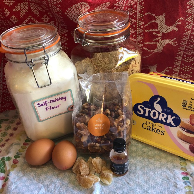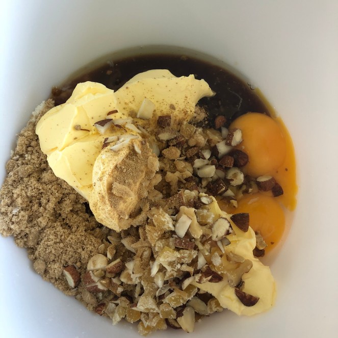 If, like me, you have whole nuts, chop them up into smallish pieces and then do the same with the crystallised ginger chunks. Keep a small handfull of both to one side for sprinkling on the top of your cake later, and chuck the rest into your mixing bowl as well.