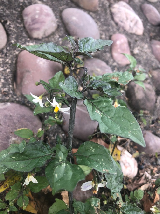 I am pretty certain it is in the nightshade/potato/tomato family, because of the shape of the flowers, and the appearance of berries this last week.