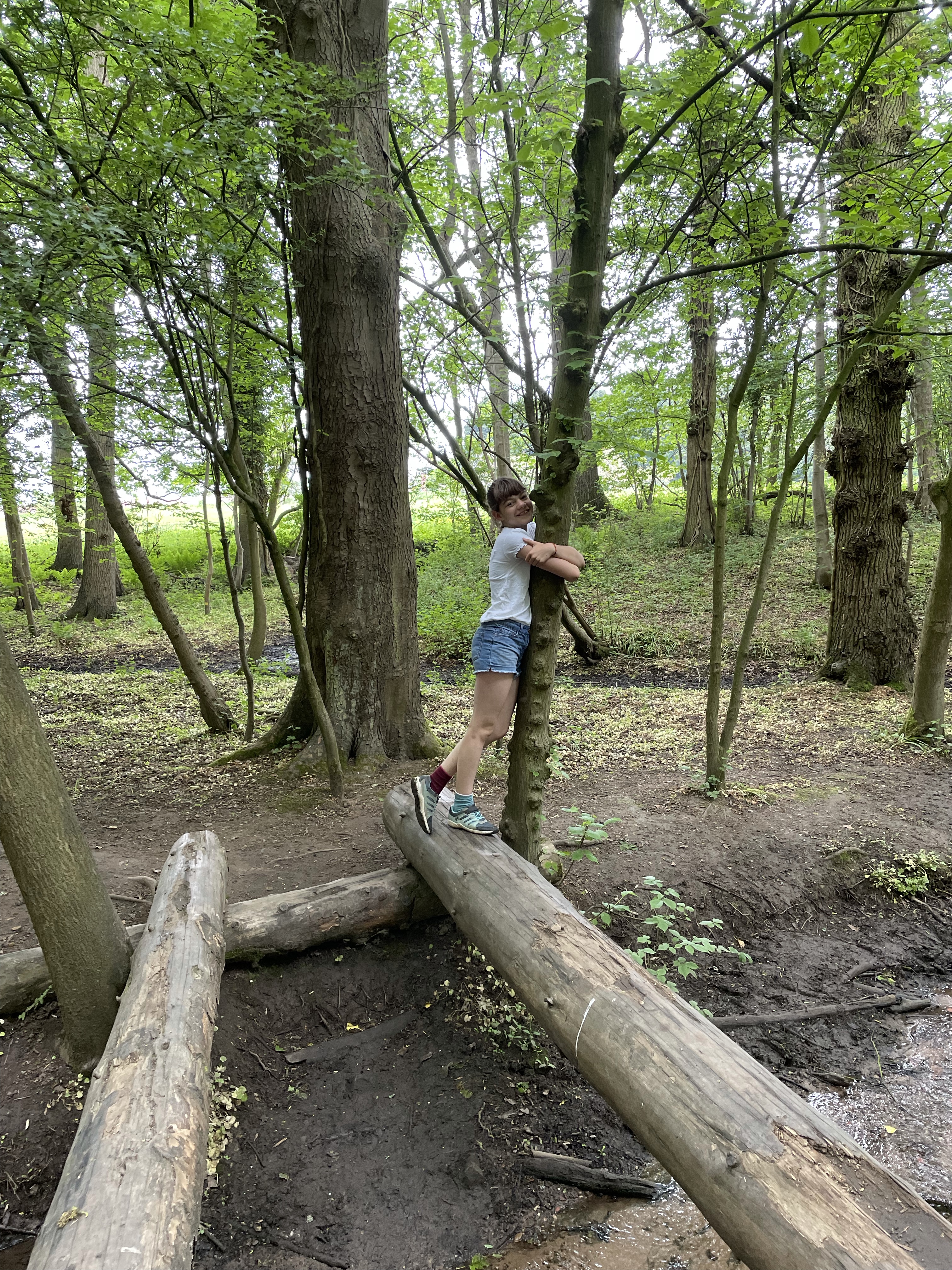 We also hugged some trees, and the kids had fun on log bridges and exploring the woods.