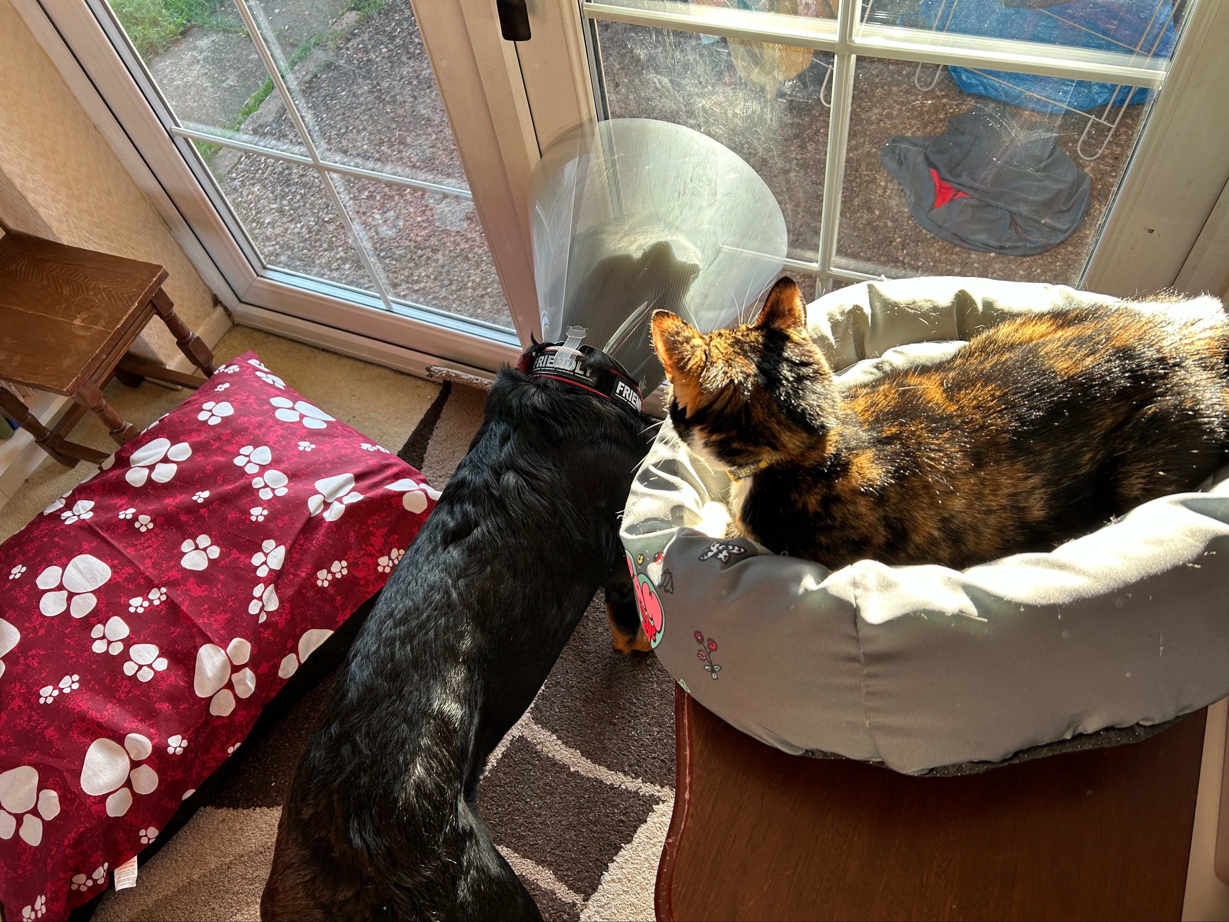 Amber is very bemused by his giant cone-head and has happily bopped him as he stumbles past a few times.
