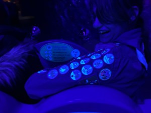 Then there’s a cute little sit on car ride through another version of Cadbury World full of cheerful little cocoa beans (I am still slightly perplexed by how these happy little beans all work at making chocolate in the factory… out of cocoa beans. Isn’t that cannibalism? Why are they all so happy about it? Why did nobody in the design team ever think that maybe this was weird?!) It is clearly aimed more at younger kids, but that doesn’t mean we didn’t have fun pretending to be on a high-speed roller coaster in our photo, and admiring how our neckers and badges all glowed in the UV cave.