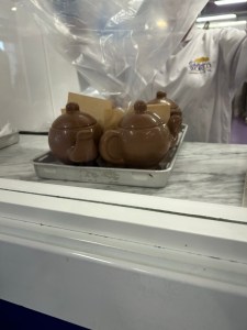 Then we were suddenly in a room where we got given a pot of melted chocolate to which we could add two toppings of our choice (I went for white chocolate buttons and fudge pieces) to eat whilst we could peer into the factory and watch them making chocolate teapots and demonstrations of how they make the different shapes for the bars.