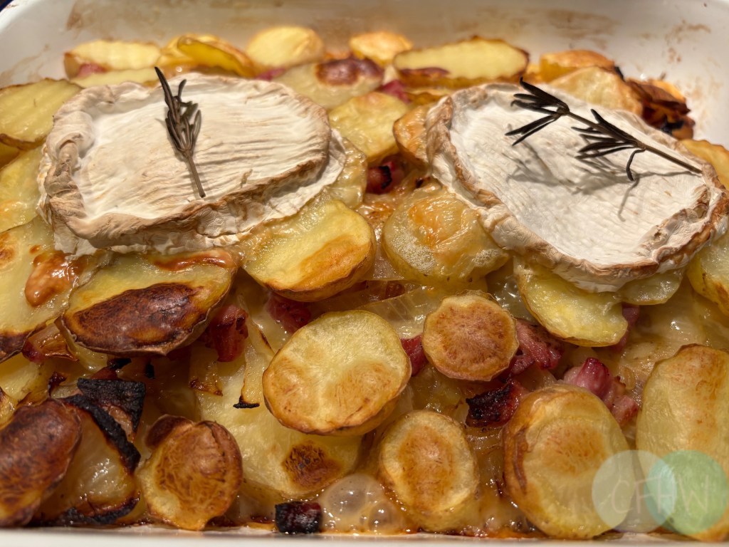 - Spoon over a layer of your onion and bacon mix, then top with more potato. Keep repeating this until everything is in the dish! It’s best if the top layer is Potato, but it doesn’t really matter.