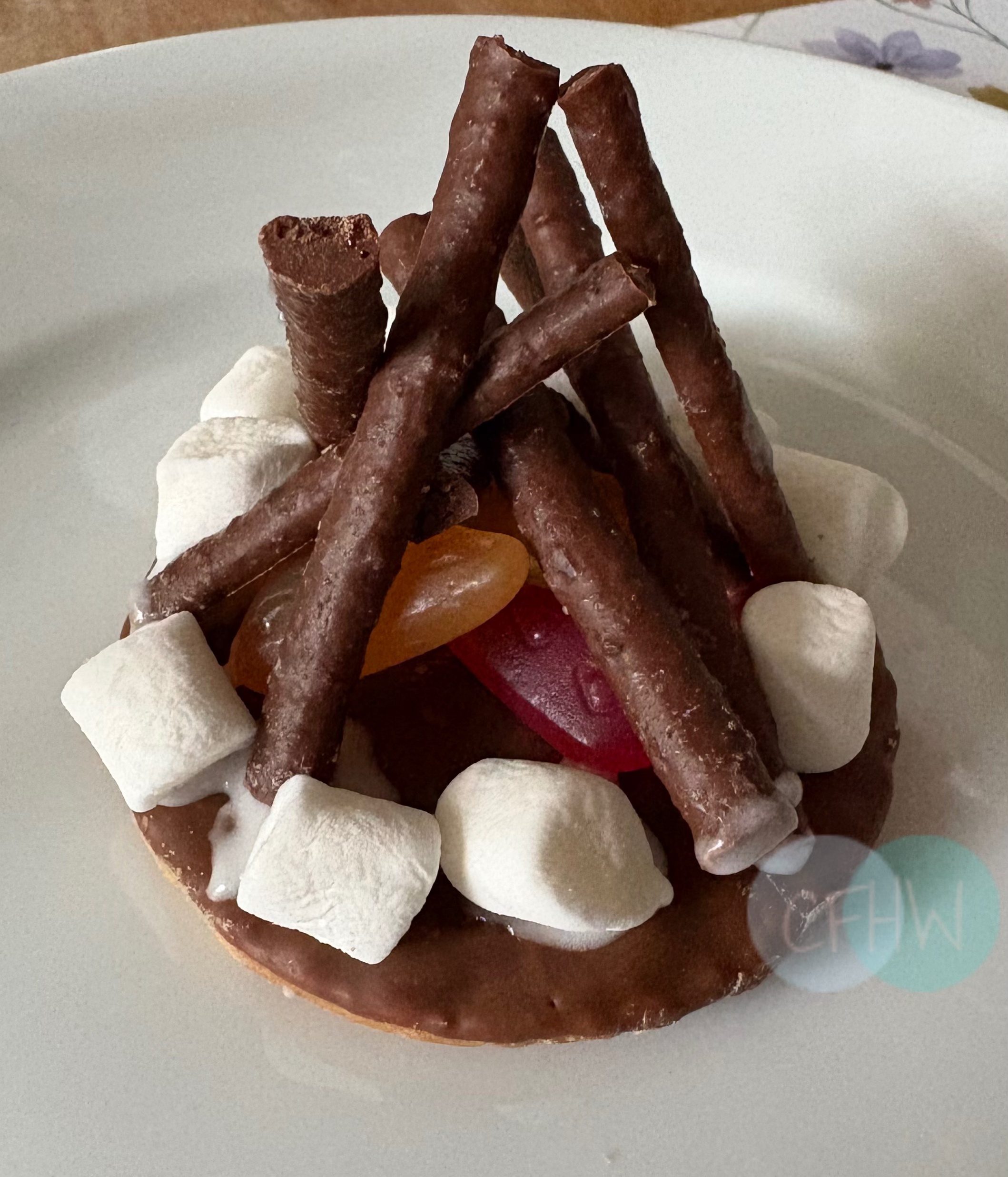 1. Using your chocolate digestive biscuit as a base (chocolate side up), place your fire coloured sweets in the middle to create your flames.