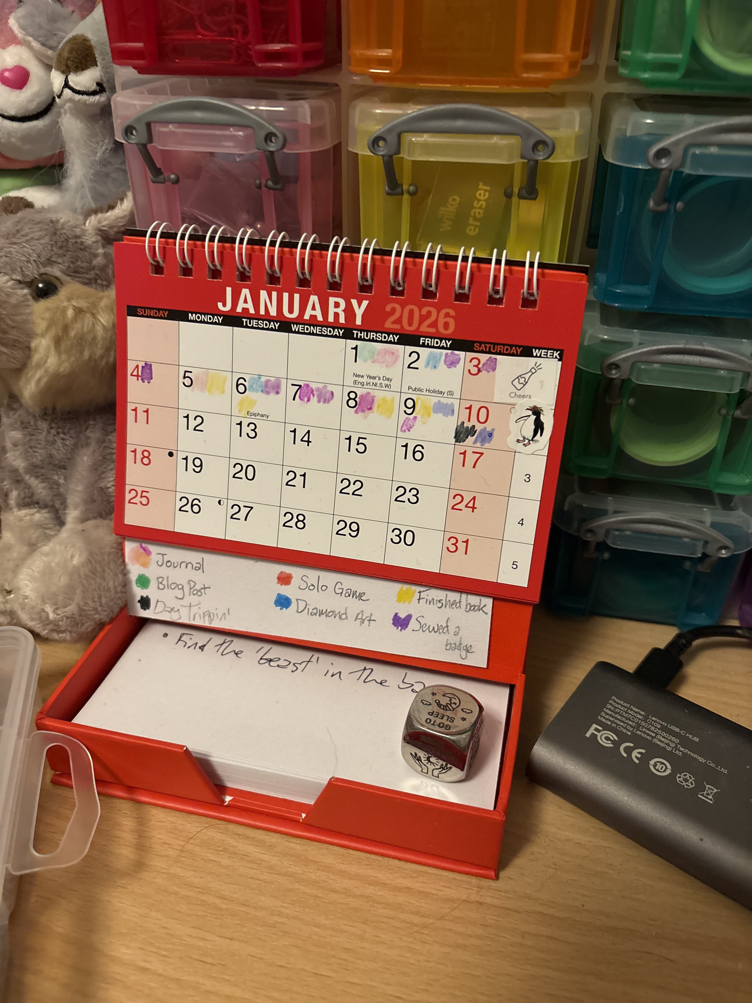 I have one solid goal – my 26 in ’26 Project. I want to do 26 ‘Junk Journal’ page spreads through the year – becuase I have so much lovely but utterly random craft stuff that I never find a use for but really want to use. Stickers, pretty paper, random bits and bobs, weird coloured pens.